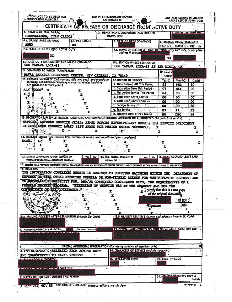 We checked the UDT/SEAL database and were not all that shocked to learn he never graduated from BUD/S. A FOIA request was sent to get his official records. We learned that he originally served 4 years and 3 months as an ABH. It also seems that he came back in as a reservist or returning Navy Veteran to add 3 more months to his active duty time. He served on the USS Tarawa and the USS Harry S Truman. Under ‘SCHOOLS’ it lists “none”. He was awarded a National Defense Service Medal, Armed Forces Expeditionary Medal, Good Conduct Medal, and a Sea Service Deployment Ribbon for his first block of service. He received no awards for the second block.