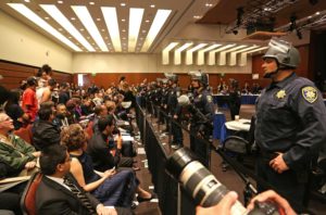 Law enforcement officers in riot gear protect the UC Regents while students protest tuition increases in March 2015, 30 students attended the protest.