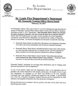 The St. Louis Fire Department also determined that the photo Daniel showed his bosses was actually of a Boston firefighter treating an injured civilian at the finish line — something FOX25 reported last month after Investigative Reporter Eric Rasmussen went to Missouri in search of answers.