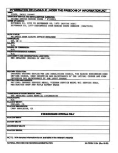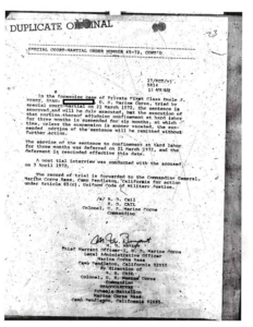 The records show that he was in the Marines and served from November 1970 to September 1975. He was released from the inactive reserve on September 5th 1977. It appears that he was a Messman until he went AWOL and was declared a deserter. But, after he was apprehended by the FBI and spent some time in the brig, he became an AmTrac Crewman.