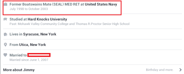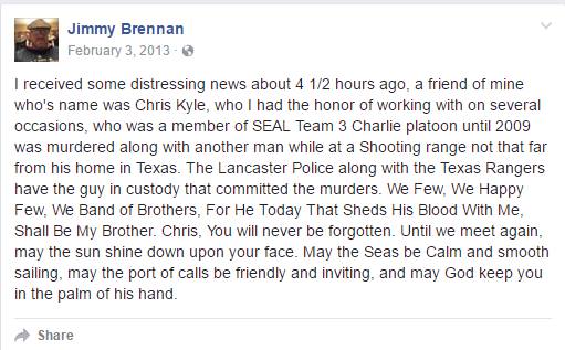 Ya, so it turns out that Jimmy Brennan never served as a Navy SEAL. He was a BM3 on the opposite coast from Chris Kyle. He did manage to get a Navy Achievement Medal while he served, but I guess that was not good enough for little Jimmy. It seems he had a perfectly honorable career that anyone should have been proud of as it was. No combat of any kind and therefore no “wounds” from combat either. I hear the members of the SEAL community frown upon those who claim to be best buds with one of their fallen. I will go out on a limb and guess that most around here don’t care much for that kind of blatant disrespect either.