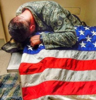 These tear-jerking pictures show the moment an Air Force dog handler cradled his dead cannine partner draped in the US flag.