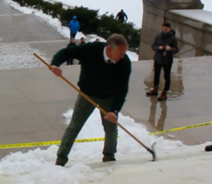 Among some of the things he did, Zinke helped officers clear away snow from the Lincoln Memorial and conducted a tour for some tourists.