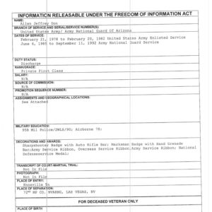 His records also say that he was in Saudi Arabia for Desert Storm, but there are no awards listed for his presence there. The 72nd MP Company of the Nevada National Guard did deploy to Desert Storm and they had responsibility for Enemy Prisoner of War Camps (EPW) 401 and 403, so he could have been there.
