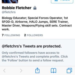 We present Robert (Robbie) Glenn Fletcher. Robbie was sent to us by someone who knew something in his story didn’t add up. On his Twitter account (@fletchrs), he claimed to be a Special Forces Operator, 1st SFOD-D, Airborne, HALO jumps, SERE Trainer, Master Diver, Weapons/Flying skill sets and Contract Work. A real John Rambo.