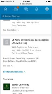 We found two LinkedIn accounts for Robbie. In one, he lists his military service as “US Army Environmental Specialist (on official DD 214) 348th Engineering Detachment May 1984 – February 1987 2 yrs 10 mos. Special Forces, Consulting to present. (All records/dates Classified) beyond 1987.