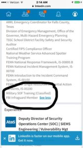 In his second LinkedIn account, he left his military “career” out of the former jobs information, but under Awards/certifications he added “Military SOF Training (Classified)”.