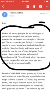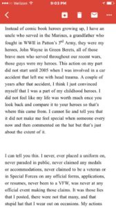 First of all, let me apologize for not calling you in person but I thought it late and quite honestly, shameful for me to even have the right to talk with you. You are correct in your findings. I canβt even explain in correct words how absolutely horrible this really is. I have had family and friends, some of which did earn the title of being in Special Forces whom I have greatly admired and respected throughout my life. To really think what I have done in words compared to what you brave men have done in deeds, is incomprehensible.