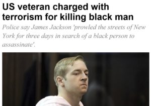 On March 20th, 28-year-old James Jackson, a white supremacist from Baltimore, fed up with “black men mixing with white women” went hunting in New York City for a victim. Jackson chose New York City because of it’s media presence and Jackson wanted to be famous. He found 66-year-old Timothy Caughman collecting bottles for recycling. Jackson stabbed Caughman to death with a 26-inch sword and then turned himself over to the police.