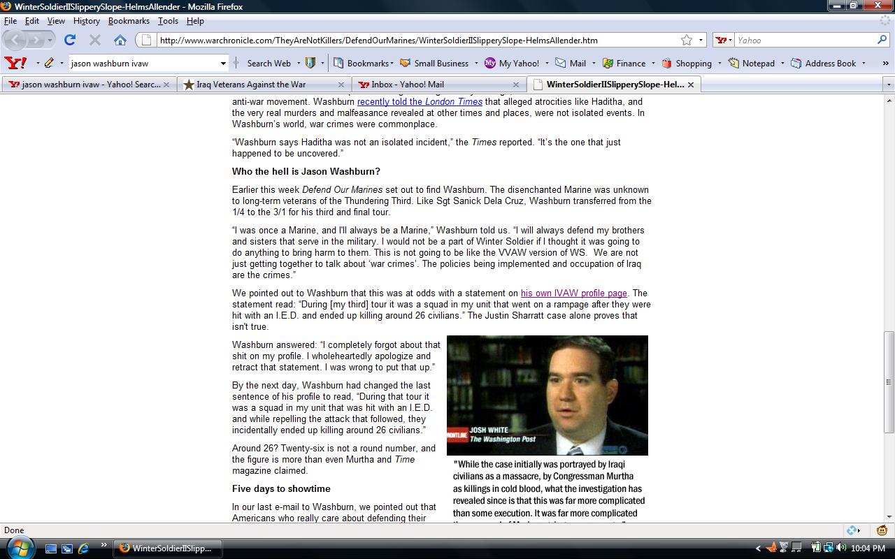 You may remember Jason Washburn from TSO’s post about his exploits as recounted in the Winter Soldier book. He was the guy who claimed that it took a burst of 40-mike-mike grenades to stop a charging woman carrying groceries. Washburn is also the guy who was busted by “Defend Our Marines” last year on his IVAW profile. Apparently, Washburn had claimed to be a member of the squad of Marines who was involved in the famed “Haditha” incident until asked about it;