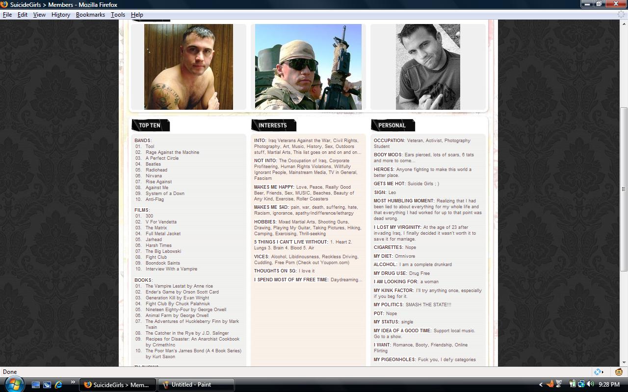 Oh, by the way, Suicide Girls isn’t a community like Facebook or My Space are communities. You actually have to pay dues to post a profile to Suicide Girls. So it’s not like he thought it was a cute thing to do that was free, so why not sign up. Washburns profile at “Suicide Girls”;