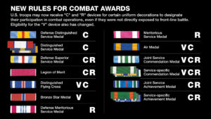 The Military Times discusses Defense Department plans to add “C” and “R” devices to the inventory of accouterments and appurtenances for military awards. The “C” is for medals that are awarded for combat on awards that aren’t already designated for combat awards – it would be attached on the service Achievement and Commendation Medals, for example. The “R” is for remote participation in combat like for drone operators.