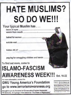 The GW Hatchet, an independent campus paper, posted a story on its Web site late last night saying it had heard from those behind the fliers, who said they had been misunderstood. According to the Hatchet, an e-mail that it received from the students said the flier was not an attack on Islam but an effort “at exposing Islamophobic racism.”