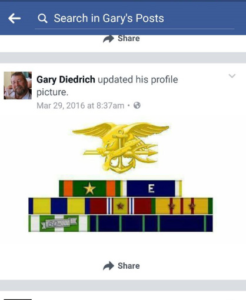 The folks at Military Phonies share their work on this Gary Diedrich fellow. He joined a Facebook group which mentors youngsters who want to become Navy SEALS. He claimed that he was a SEAL in Vietnam and that this is his rack of awards;