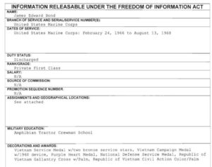 James Bond is My friend. That is the name on his drivers license. He talks about his time in Nam and it was pretty rough on him. He also has photos. He won medals. He is disabled, has PTSD and wants to help others in the same boat. Why should he be a target of ridicule? He wants to reach out to other vets and help them find healing. He wants to bring attention to the problem of vet. suicides. You all are bullying him and are the ones who should be ashamed. James Bond is a good man.