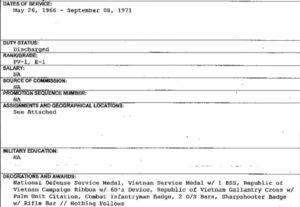 Well Sir, it’s a toss-up. The Form 2-1 appears to have been reconstructed at some point. There is the first year and a half of his service that is not reflected on the 2-1. May have had a previous tour as it appears he only hit country for about a month in 1969, but the FOIA says he rates two Overseas Service Bars which would account for 12 months in a hostile fire zone. Whether that’s true or not is a question only he can answer.