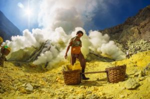 A miner collects sulfur in a crater in Indonesia. According to Your Shot photographer Gleb Tarro, hundreds of miners “make the perilous journey climbing 9,000 feet to the summit and then 3,000 feet down into the crater.” Sulfur is used in manufacturing everything from matches to fertilizer to film.