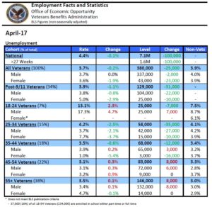 Attached is our monthly ‘cheat sheet’ for your use and information. The national unemployment rate for April 2017 decreased slightly from 4.5% to 4.4% and the Veteran unemployment numbers for April 2017 decreased from 3.9% to 3.7%.