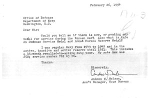 He was finally discharged in 1952. In 1954, he wrote to the Navy asking what awards he earned for the Korean War;