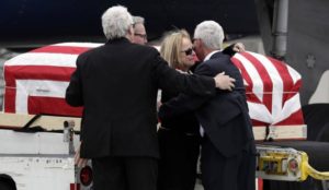 Deborah Crosby, center right, hugs her brother John Crosby, right, in front of her father’s casket after its arrival to the airport Friday in San Diego. (Associated Press)