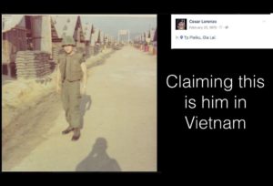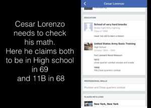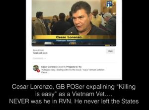 The folks at Green Beret Posers Exposed discovered this fellow, Cesar Lorenzo, who claims the whole empanada – Ranger, Special Forces, combat veteran in the Viet of the Nam. In a video at Stories of Service he correctly tells his interviewer that he was born in 1954, but then he says that he joined the Army in 1968, when he was 15 years old (do the math, Cesar) and then he recounts his derring-do – you really have listen to it in order to appreciate the depth of the BS.