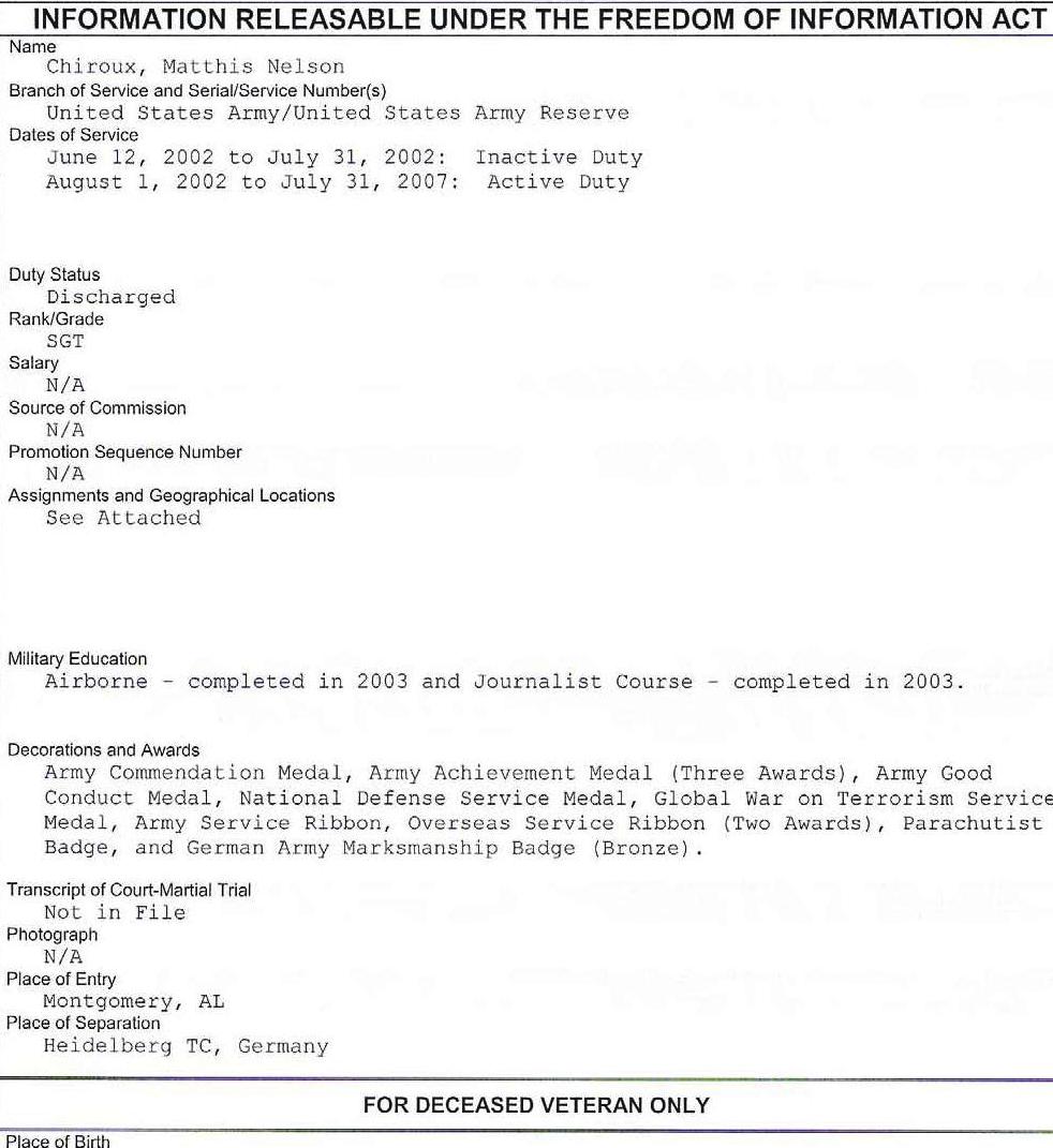 So I got our good friends at POW Net to get me FOIA request on Chiroux’ record. Keep in mind, if he was in the IRR, I wouldn’t be able to get his records.