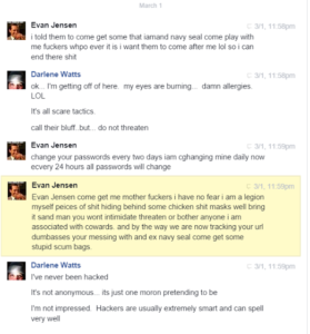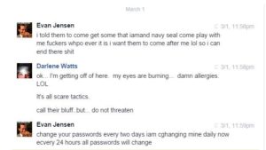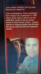 I guess this fellow, Evan Jensen, was busted by Don Shipley a few years ago, but somehow his records showed up in my inbox again. I have to guess that he’s out there again, thinking the brouhaha has settled down. He’s one of those paranormal people. He edits the Paranormal Herald World News and he has a radio show “Beyond Reality; Paranormal Talk Radio. He claims to “out” phony ghost hunters, but he’s friends with phony Air Force Major/Vietnam veteran David Rountree. Anyway, folks were challenging him about something and he threatened to bring some of his SEAL warrior training to bear on their ass;