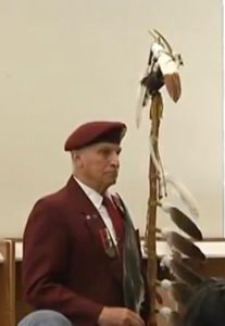 That mishmash as you call it is an Eagle Staff given to warriors to bear which this lying fuck is not one of, a real bearer must have a strong moral fibre, a pure heart and live a pure honest life.