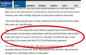 Judging by the extensive press coverage he has received over the years, it appears that he’s being pimped as the veteran “go to guy”. The leadership of the Windsor Veterans Memories Project have showcased Mr Kelly at many of their events so, one would assume that they must have verified his military service. Factual errors and omissions occur due to misremembering & that can be forgiven. However, complete fabrications, not so much…
