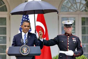 Obama could’ve moved his press conference indoors (it’s not like nobody predicted the rain), held his own umbrella, or just taken a little moisture. Instead, he had a Marine hold his umbrella. Whether it was because he was just inconsiderate, wanted to send a subtle message about his authority over and/or opinion of the military, or just because he gays off on telling people what to do, it was a douche move. The Marine correctly recognized that, complete bullshit or not, he’d been told to do something by the Commander-In-Chief, and he did it in a professional manner. Like all of us, it was probably not the first (or last) time he’s ever gotten a ratfuck assignment from his boss.