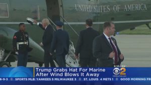 On Saturday as the Commander-in-Chief was boarding Marine One, rotor turbulence blew off the headgear of an attending Marine. President Trump stooped, grabbed the hat and replaced it on the stunned young Marine’s head, patting the embarrassed, young serviceman on the arm. The hat immediately blew off again and Trump went after it a second time while the Marine correctly maintained his post standing rigidly at attention. Trump this time handed off the hat to the Air Force colonel attending him and boarded the helicopter: