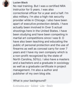 You’ve probably seen this guy, Michael Douglas Thervil who goes by Lucien Black on Facebook. He claims to be a military-trained firearms instructor, that he trained special forces soldiers in firearms handling and he claims that he was a security officer while he was in the military, among other things;
