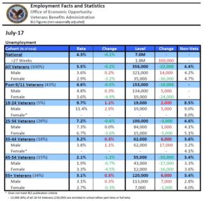 The Veterans Benefits Administration and the Bureau of Labor Statistics sent us their unemployment numbers for July and overall employment of veterans has improved by .2% last month, while the overall national rate improved by .1%. Post-9-11 veterans are doing .2% worse than the national rate.