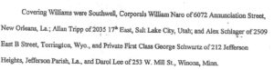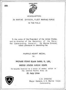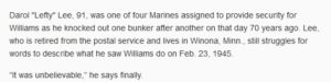 Of, course no one does that kind of stuff alone. Williams was supported by fellow Marines who provided covering fire for him. According to early reports, PFC Wesley Strickland, CPL William Naro, CPL Alan Tripp, CPL Alex Schlager, PFC George Schwartz were covering Woody. Furthermore, two men died covering him and research is currently being done to ascertain their identities. Well, somehow, Darol “Lefty” Lee got his name on that list. Here is a paragraph in an original draft of a dispatch write-up of the incident from the National Archives;