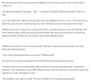 Somehow Lefty convinced Woody, scholars and archivists for a long time that Lefty had been there, and, of course, Woody and others believed him. Woody had fought with Lefty on Guam and knew he was in his same company and had landed on Iwo Jima with him so he had no reason to doubt Lefty’s story, especially since he was a brother Marine. Here’s an article from the Winona Daily News;