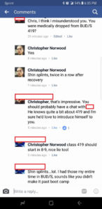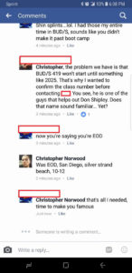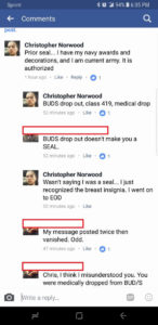 In the Book of the Face conversation thread posted above, he’s also claiming to be a medical drop (shin splints) from BUD/S Class 419, which one of the commenters who is challenging him states won’t actually start until sometime in 2025.