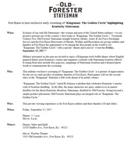 For those of you who might be in the Fort Knox area and find yourselves without plans for Friday night, the folks at the Old Forester distillery invite you to an exclusive screening of the movie “Kingsman; The Golden Circle”;