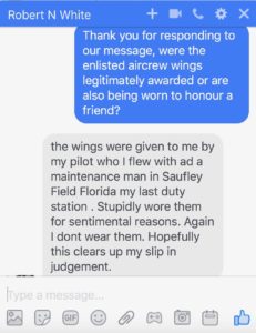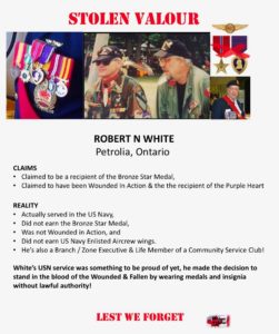 White has surrendered the bogus Bronze Star, Purple Heart and USN Enlisted Aircrew wings, they have been sent to the US Consulate in Toronto for disposal.