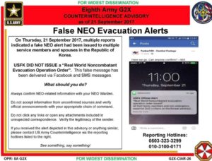 [US Forces Korea] said it received “multiple reports of a fake text-to-cell and social media message regarding a ‘real world noncombatant evacuation operation (NEO) order issued’” on Thursday, USFK said in a message posted on its Facebook page.