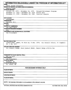 Schlenker spent three years on active duty and he was discharged as a Private E-1, not the Sergeant First Class (E-7) that he claims. He was an infantryman in the 3/187th Infantry, of the 101st Airborne Division (it was Airborne only in name at the time) he earned the Air Assault Badge and that’s it. I remember the 101st wore a cute little royal blue beret in those days, but there were no special forces units on Fort Campbell at the time he was there.
