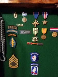 I noticed that his wanking box is missing a basic necessity for a “recon” troop of that era; the Recondo badge/tab, since he has the recon/lrrp thing cookin’. I know this because my dad was an actual LRRP in Vietnam in the 101st and was in the 2nd class to graduate Recondo School. Of course my dad’s shadow box isn’t quite as extensive as this chucklehead’s. Of course, dad had some badges that you couldn’t see unless he was wearing just a pair of shorts. Like the scar/badge that ran from his sternum to his junk, or the multiple cute little holes in his sides/arms/legs from the grenade and AK fire.