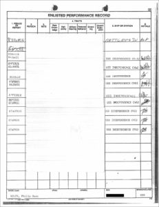 Phil’s summary sheet shows that he served both on active and reserve duty and left the Navy as an E-3. A total of 3 years, 11 months and 28 days of active duty, with reserves a total of 6 years, 5 months and 20 days. On the summary sheet, it shows Phil being assigned to the USS Independence CV-62, he has no Combat Action Ribbon or the SEAL designation. No record of Phil attending BUD/S or being stationed at a SEAL Team. Phil was never in BUD/S class 102, that class graduated a few years before Phil joined the Navy.