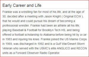 Our partners at Military Phonies share their work on this fellow Frank Roberto who wrestles professionally under the name Frankie Starz. He claims that he served in Marine Recon units and with the elite ANGLICO (Air Naval Gunfire Liaison Company).
