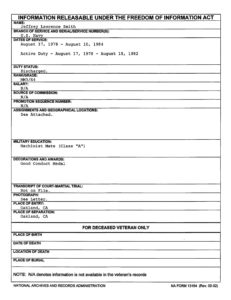 Jeff’s summary sheet shows that he served HONORABLY in the Navy and was discharged as an E-4. There does not appear to be any reason Jeffrey Lawrence Smith and his family should not be proud of what he actually did do in the Navy. He served during a time when most others wouldn’t, a total of 4 years and 1 day of active duty. There is no record of Jeff attending BUD/S, being stationed at a SEAL Team, or ever attending jump school. We have no idea how he could have been involved in a parachute accident.