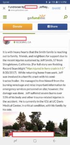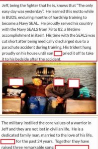 Our partners at Military Phonies send us their work on yet another person who told his family that he was a Navy SEAL. They found that wasn’t true after Jeffrey Lawrence Smith had a tragic accident that has caused him to be hospitalized since late August. The family set up a GoFundMe tin cup to help them with the hospital bills and, without knowing better, they added the stories they’d heard all of their lives about their father’s military career;