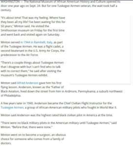 Someone sent us their work on this fellow, Russ Minton, who was interviewed in Washington, DC by WTOP about his time with the Tuskegee Airmen when he visited the African-American History Museum;
