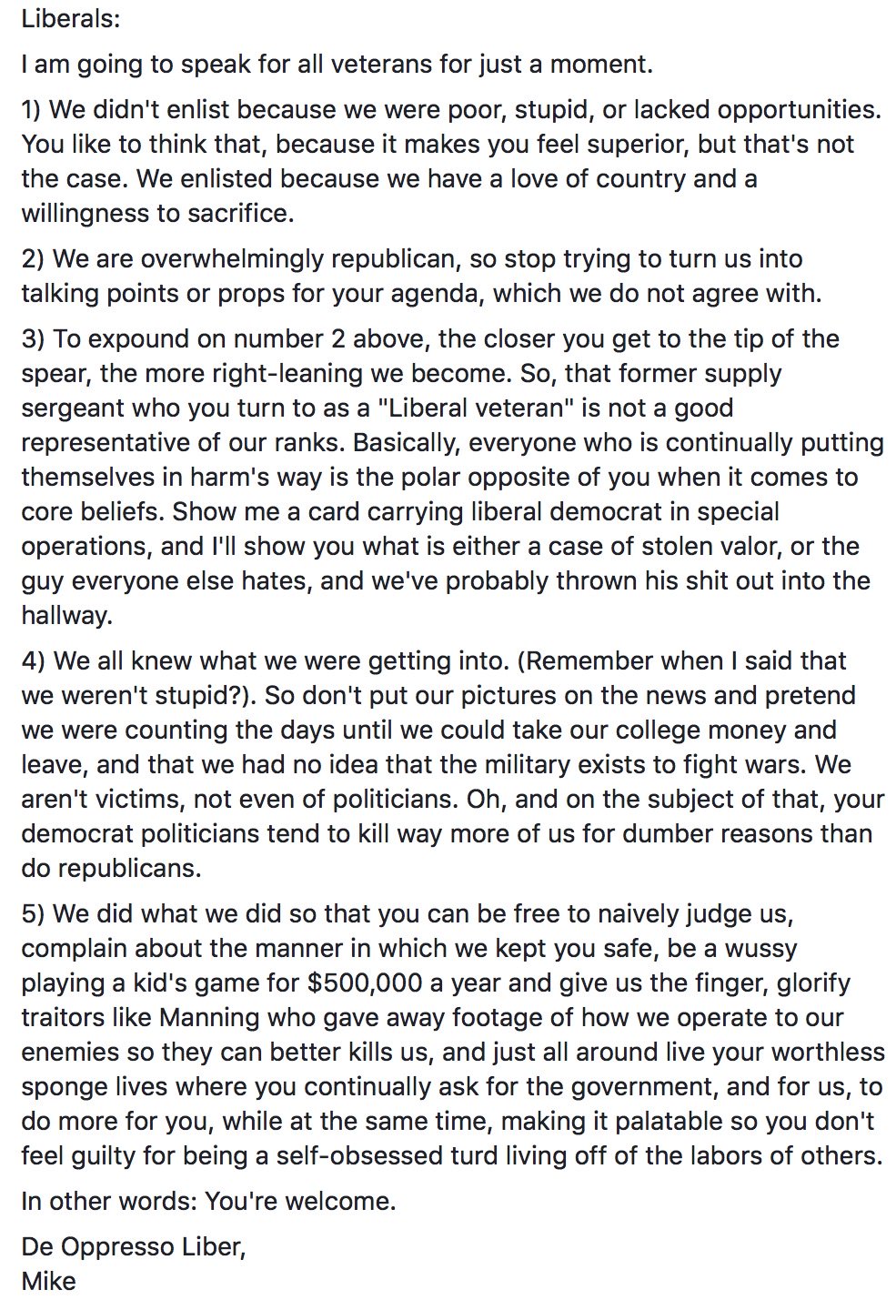 Oh my God…such truth in what he says. Especially number one. I always HATED when people assumed I joined and stuck around because I “had no other options”. No fucktard, I did what I did for 20 years because I LOVED IT, my COMRADES IN ARMS, and the IDEALS of what this country was founded on; not because I was too stupid to go to college and too poor to do anything else.