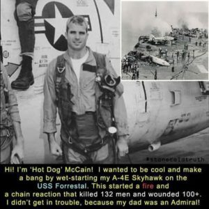 All that aside, McCain did not initiate the fire that claimed 164 lives onboard USS Forrestal on July 29, 1967. The attached meme states that McCain was showing off, and caused a wet start which in turn started the fire that turned into a tragedy.