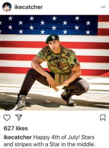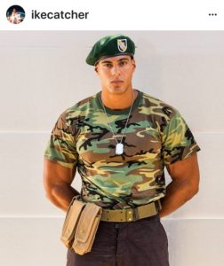 So… here comes Ike Catcher who evidently follows actor social media and dresses up in Austrian Commando camo when he’s not pumping iron at Muscle Beach– where he might find a Hollywood agent. It seems fairly obvious where this is going: