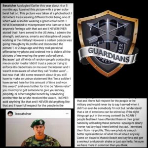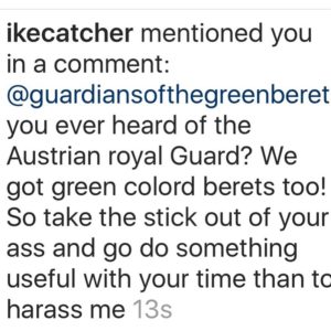 Our partners at Guardians of the Green Beret send us their work on this fellow Ike Catcher who was spotted by someone who trolls the internet. When confronted, Ike said some crap about the Austrian Royal Guard, but the Austrian Royal Guard doesn’t wear a 5th SF Group flash on their beret;